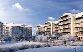 Föreningen uppför 42st svanenmärkta bostadsrätter med stor bredd och variation som hittas på fastigheten Rallarrosen 7 i Umeå,